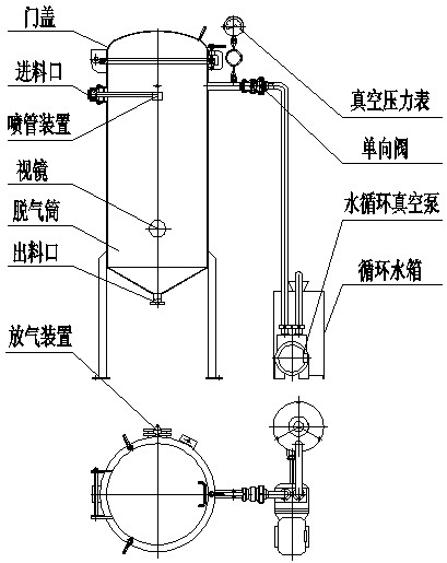 7、停机时,关闭水循环真空泵电源,停止抽真空,并打开放气口,破坏筒体内的真空后,待螺杆泵全部排出料液后,关闭螺杆泵电源。